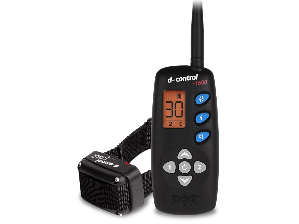 Dogtrace d-control 1600 s dosahom 1600 m, pre všetky plemená, 30 úrovní, LCD displej. Vysielač má zvukovú funkciu, stimulačný impulz s úrovňami 0 - 30 a nastaviteľný kontinuálny impulz (funkcia booster), pri ktorom si môžete zvoliť ľubovoľnú intenzitu stimulačného impulzu, ako ste si zvolili na tlačidle stimulačného impulzu.