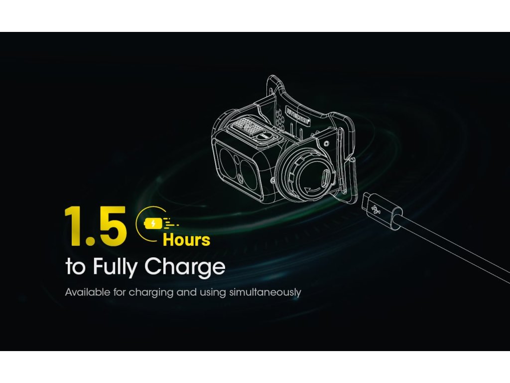 Čelovú baterku môžete nabíjať cez port USB-C, ktorý je skrytý pod skrutkovacím krytom. Úplné nabitie svietidla trvá približne 2 hodiny a 25 minút. Svetlo vám oznámi, kedy je plne nabité: modré svetlo LED na hornej strane baterky prestane blikať.