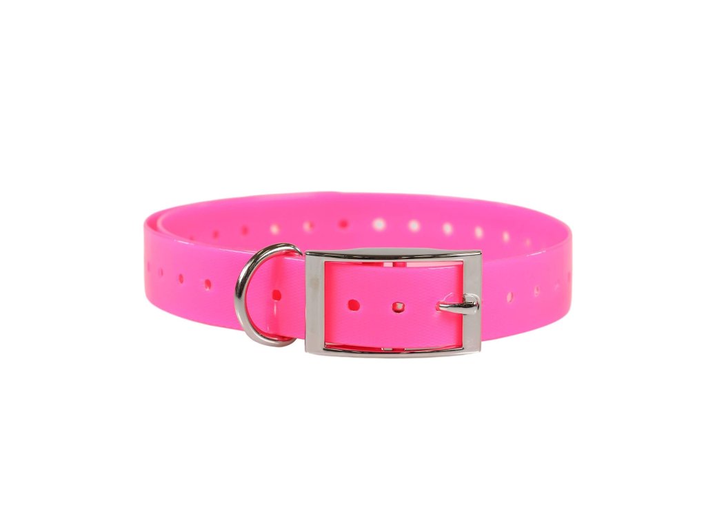 Ružový lesklý plastový obojok s okom na pripevnenie vodítka. Ľahko sa čistí vodou alebo vlhkou handričkou.