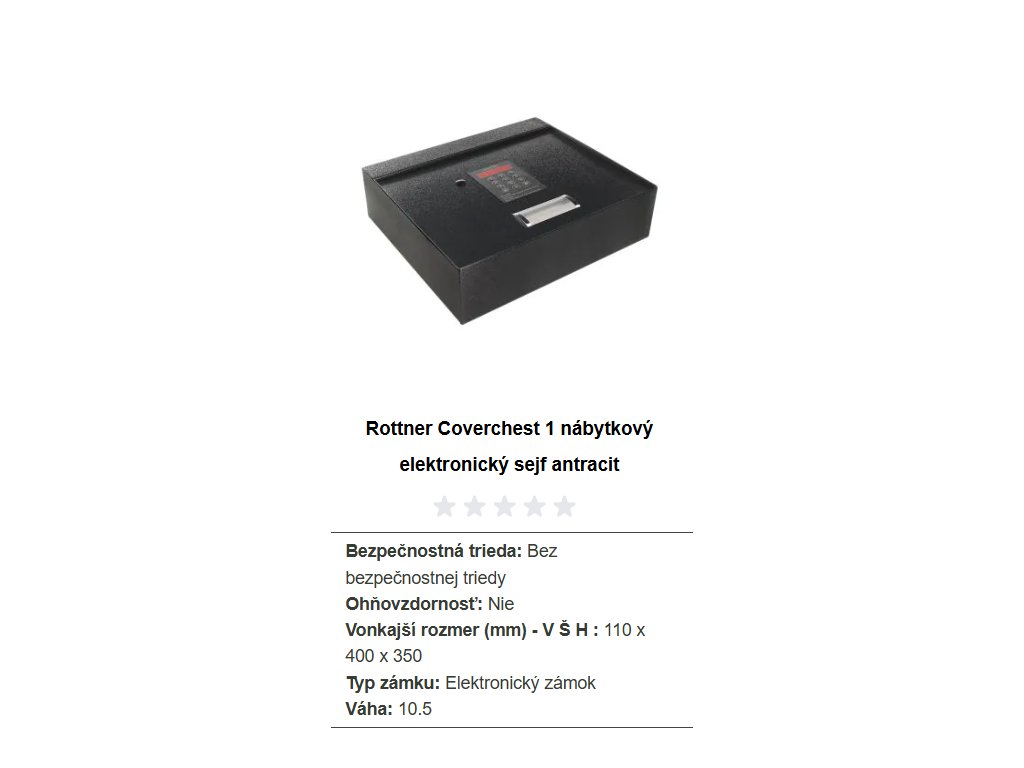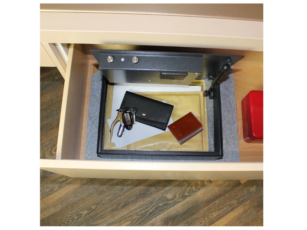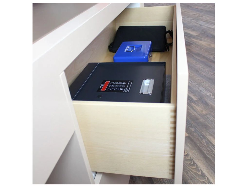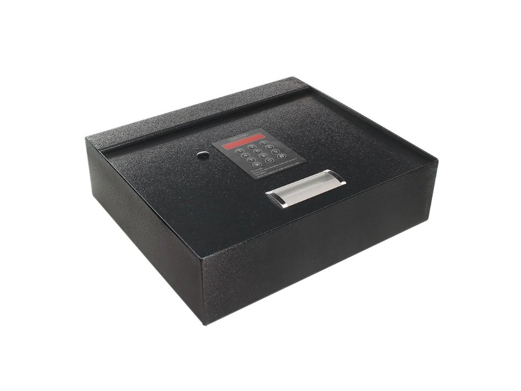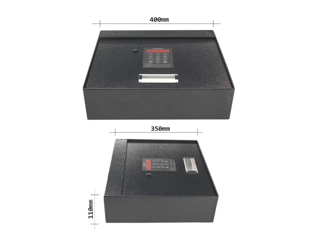 Antracitový sejf ponúka netradičný tvar, kedy je klávesnica na zadávanie kódu umiestnená na hornom veku sejfu. Po zadaní kódu stačí zdvihnúť horné veko sejfu a máte okamžite prístup k uloženým veciam. Sejf má elektronický zámok spolu s mechanickým núdzovým otváraním. Napájanie zámku je riešené prostredníctvom klasických 1,5V AA batérii. Jednoplášťové vyhotovenie sejfu má na spodnej strane pripravené otvory na ukotvenie. Kotviaci materiál je súčasťou balenia.