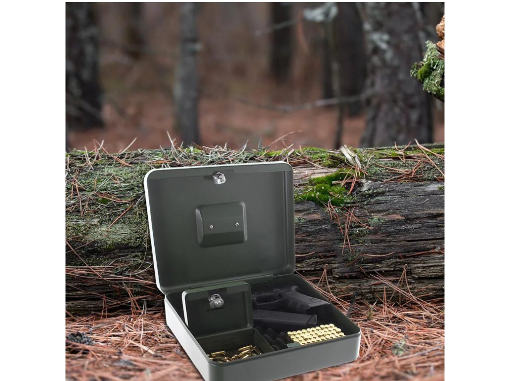 Zelený oceľový box na krátku zbraň a muníciu je vhodný na uzamknutie a prípadné prenášanie vďaka zapustenej pozinkovanej rukoväte. Vnútro je vystlané mäkkou penovou vložkou, aby nedošlo k poškodeniu zbrane počas prenosu. Malá, samostatne uzamykateľná kazeta vo vnútri boxu je ideálna na uschovanie munície. Vaša zbraň aj munícia tak budú uskladnené pekne pohromade a prístup k ním budete mať len vy.