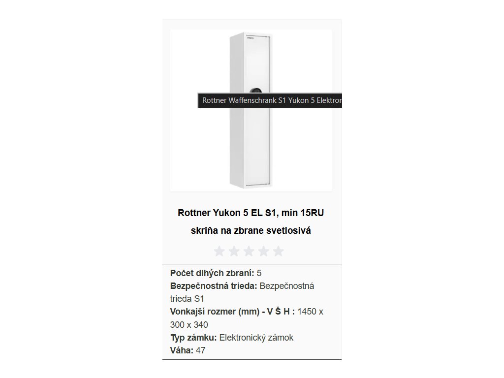 Najlacnejšia skriňa na uschovanie až 5 dlhých zbraní v ponuke. Skriňa na zbrane Yukon disponuje certifikovaným elektronickým zámkom, ktorý je napájaný 1 x 9V batériou (nie je súčasťou balenia). Skriňa má certifikát bezpečnostnej triedy S1 ČSN EN 14450) a je dodávaná v jednoplášťovom prevedení. Vo vnútri skrine sa nachádza vnútorná schránka s cylindrickým zámkom a držiak pre náradie na čistenie zbraní. Materiál na ukotvenie je súčasťou balenia.