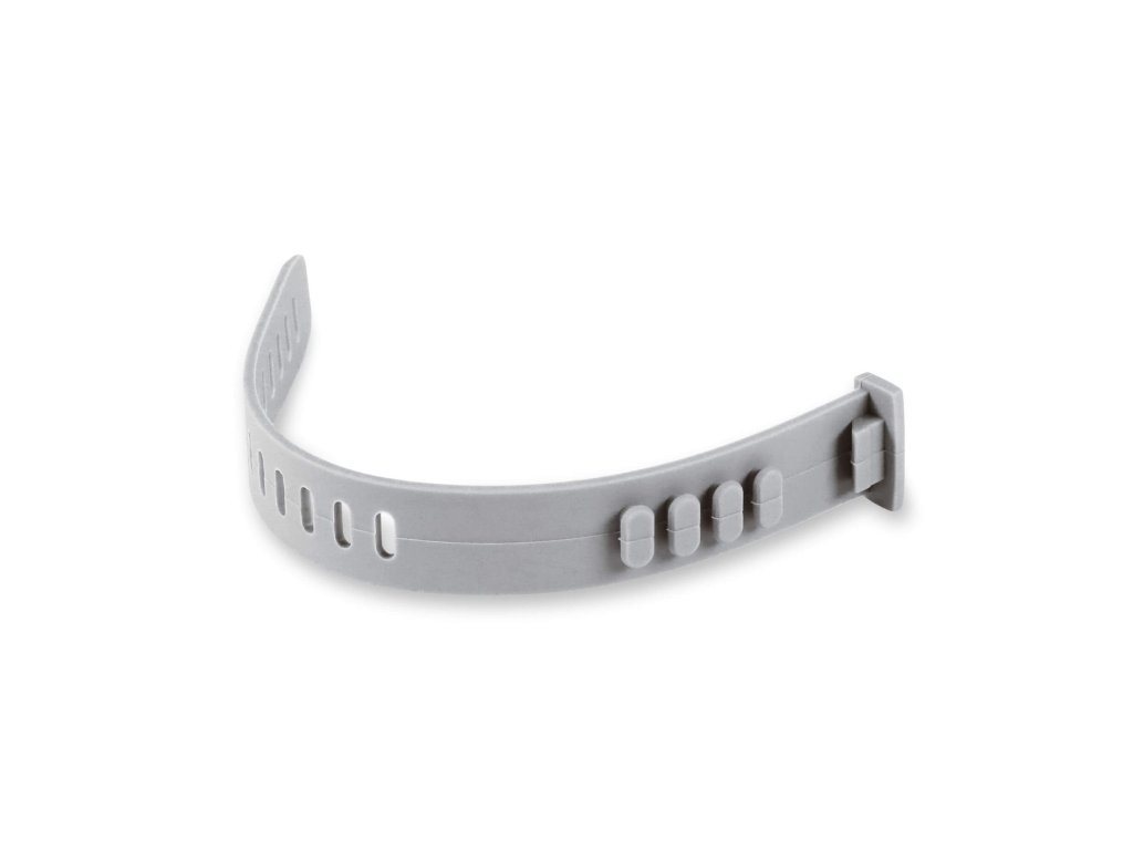 Šedý silikónový remienok vyrobený zo zdravotne nezávadného materiálu. Pohodlný, mäkký a odolný. Nastaviteľný obvod v rozsahu od 5 do 10 cm. Možno ho pripevniť na prst alebo riadidlá kolobežky, bicykla alebo saní.