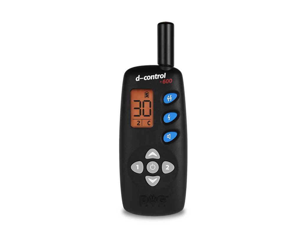 Vysielač Dogtrace s dosahom 600 m, s funkciami zvuk, stimulačný impulz a booster. Umožňuje výcvik dvoch psov - spárovanie dvoch prijímačov (tlačidlá 1 a 2).